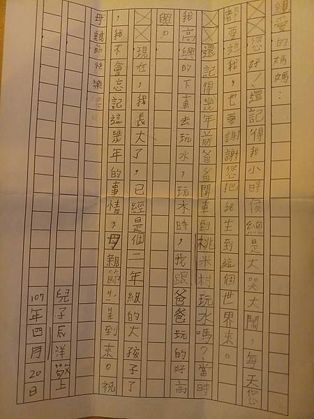 前幾天在信箱收到一封信(現在很罕見),是寄給老婆的,一看字跡,很像哥哥寫的字(而且寫的特別工整),後來打開後才知道,原來是哥哥在學校寫給媽媽的一封信,老師特別讓他們用郵寄的方式寄給媽媽,很有意義,也謝謝老師的用心,母親節要到了,這是最棒的母親節禮物呀!
