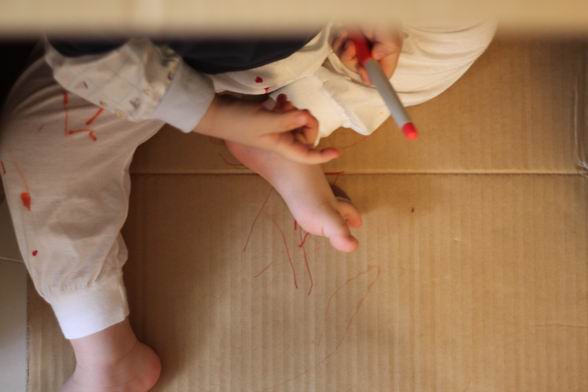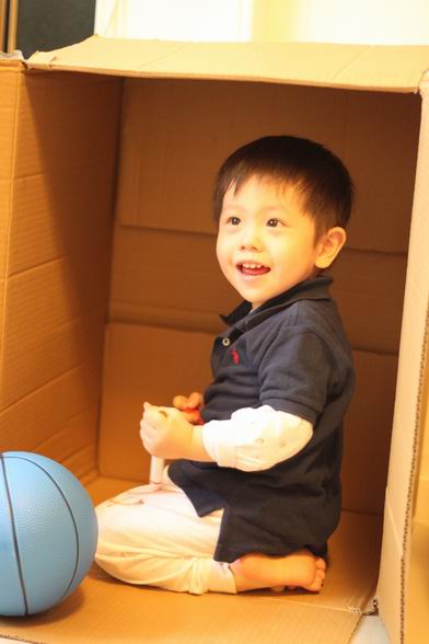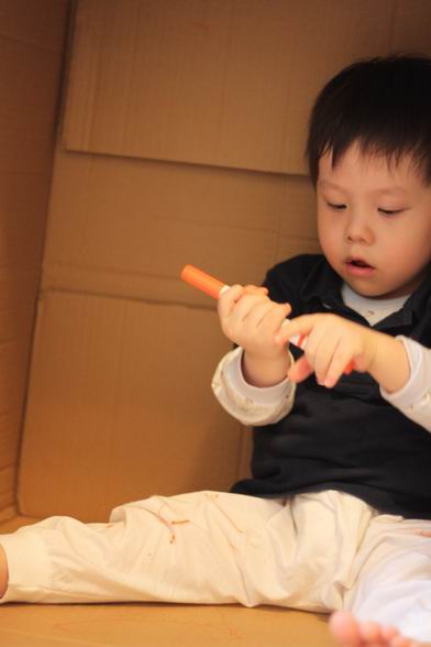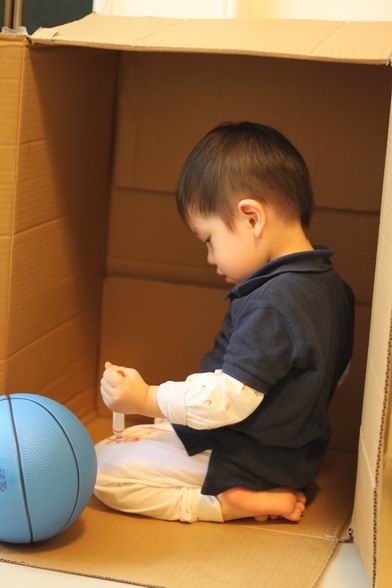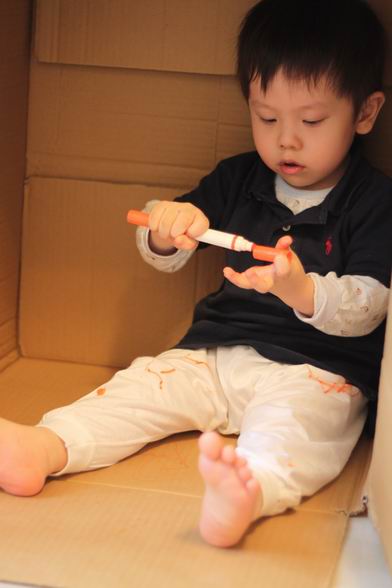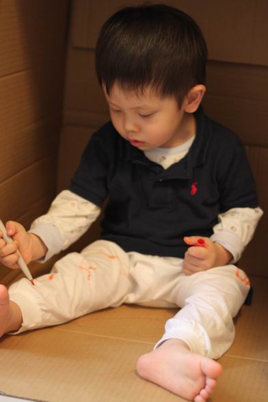 家裡多了一個大紙箱 就成了洋最近喜歡的秘密基地 看他豪邁的在裡面畫畫 連褲子都畫得亂七八糟 媽媽說,就隨他吧^^ 看他開心得很哩~~